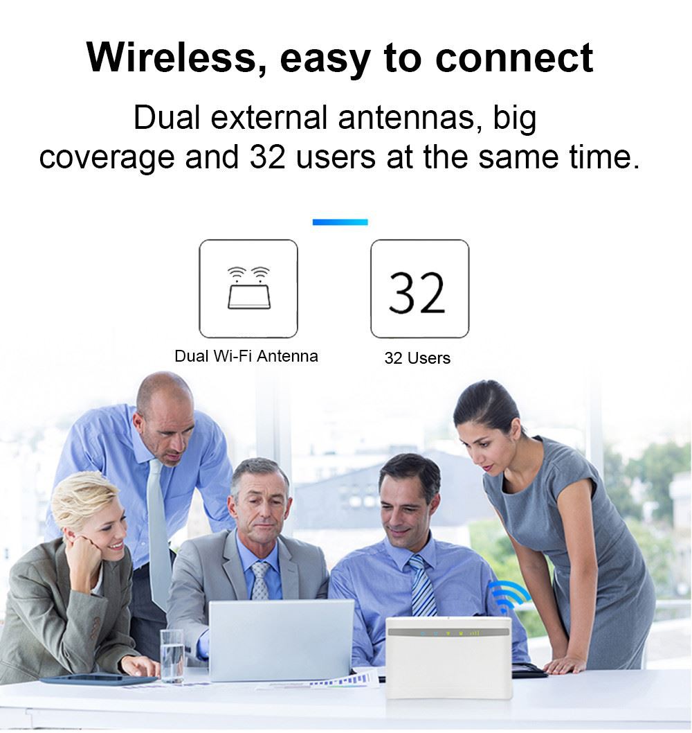 Dit is een zeer geavanceerde LTE indoor CPE-router. Het is ontworpen om te voldoen aan geïntegreerde gegevens- en Wi-Fi-toegangsbehoeften voor residentiële, zakelijke en zakelijke gebruikers. (kan worden aangesloten op SMA connector externe antennes!) 150M hoge snelheid, LTE FDD: DL / UL 150M / 50 Mbps (Cat 4). Breng 4G over naar Wi-Fi, geen breedbandtoegang nodig, plaats een simkaart, plug and play. WiFi Dekt het hele appartement en huis, geniet overal van snel internet. Eenvoudig aan te sluiten, dubbele externe antennes, grote dekking en 32 gebruikers tegelijkertijd.