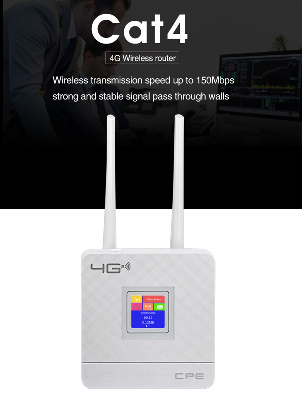 CPE903 is een krachtige 4G draadloze router met 4G SIM-kaartsleuf en MIPS-netwerkprocessor, het is een oplossing voor enterprise, home, company, office's Wi-Fi-netwerken. Het is compatibel met de IEEE 802.11b / g / n-standaard, de gegevenssnelheid bereikt tot 300 Mbps. Met dubbele externe antenne is het Wi-Fi-signaal stabieler en groter bereik. Het ondersteunt 10 Wi-Fi-gebruikers tegelijkertijd.